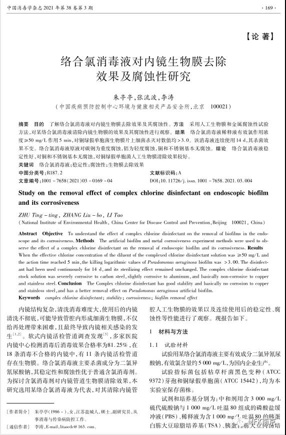 由中國疾病預(yù)防控制中心環(huán)境與健康相關(guān)產(chǎn)品安全所撰寫的《絡(luò)合氯消毒液對(duì)內(nèi)鏡生物膜去除效果及腐蝕性研究》近期發(fā)表于《中國消毒學(xué)雜志》。